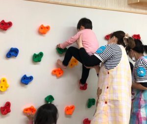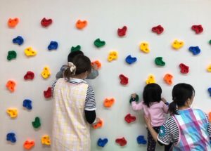 273平米のひろーいお部屋にプレイルームが出来ました。壁にはボルダリング。0歳児さんでも登れます。 横這いしかできないかなあ?って心配していたのは先生達だけ・・ 子供達はどんどん上まで挑戦しています。