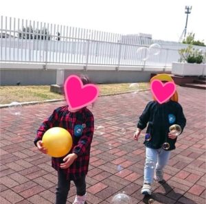 大日保育園では今日はお外でシャボン玉をしました。 ふわふわ飛んでいくシャボン玉にみんな大喜び✨ まてまて~ パチン! 消えちゃったね~ もう一回! 楽しいね♪
