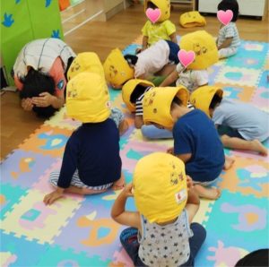9月1日は防災の日でした。 保育園で避難訓練を重ねていても予期しないことが起こるのが災害です。 それぞれが知識や意識をしっかりと持てるようにしていきたいです。 大日保育園でも日々防災訓練を行っています。 今日は防災頭巾のかぶり方を練習をしました。 アンパンマンが上手にかぶっているのを見ながらやってみよう🎶 子ども達もみんな上手に頭を守ることができました❕