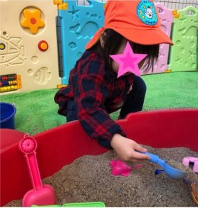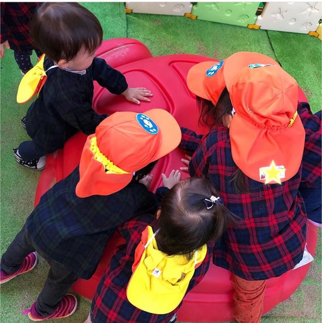 カニさんの砂場で遊ぶ前は『カニさ~ん、おはよ~🎶』遊んだ後は『カニさん、またね~🎶』とカニさんをトントンする子ども達です💖