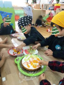 大日保育園では、みんなでクリスマスケーキを作りました! クリームをたっぷり塗ったスポンジにいちご、キウイ、ミカンを飾り付けます