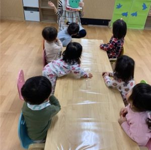 「お顔にはどんなパーツがあるかなあ??」 お目目にお口にお鼻♪ みんな真剣に先生のお話を聞きます