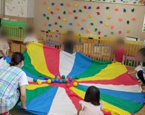 3月に卒園した2歳児さん達が楽しく行っていたパラバルーンを当時1歳児クラスだった子ども達はキラキラした瞳で眺めていました。