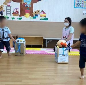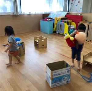 空っぽの段ボール車を引っ張ってアンパンマンとペンギンさんを迎えに行ってあげます!