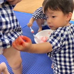 2歳児さんが泡で遊びました♬ あわあわ~ふわふわ~ ふ~っと吹いたり♪ 色を付けたり♪ 石鹸の良いにおいに包まれて楽しい泡遊びをしました❤ ペットボトルで作ったシャボン玉吹きで画用紙に泡を吹いてみよう♪ 色付の泡が画用紙に不思議な模様を描きだすよ!…