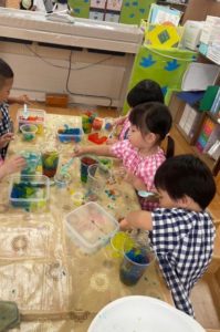 寒天の感触を楽しみながら、カップやお皿にカラフルな寒天を盛り付けて、ごっこ遊びをしました❤