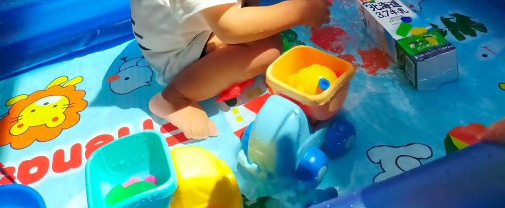 子ども達は冷たい水が気持ちがいいようでプールに張った水を手で触って水の感触を楽しんでいます。