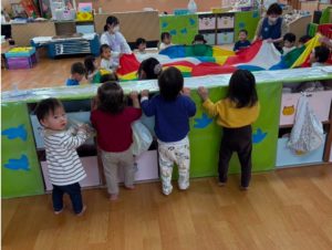 1園、2園合同で1歳児さんがパラバルーンで遊びました♪