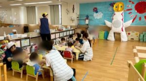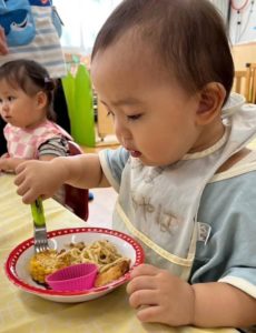 今日は1歳、2歳児さん合同で給食を食べました!!