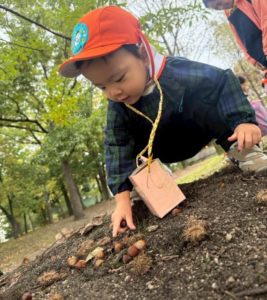 自分たちで製作をしたどんぐりバッグがいっぱいになるまで夢中で拾いました❤