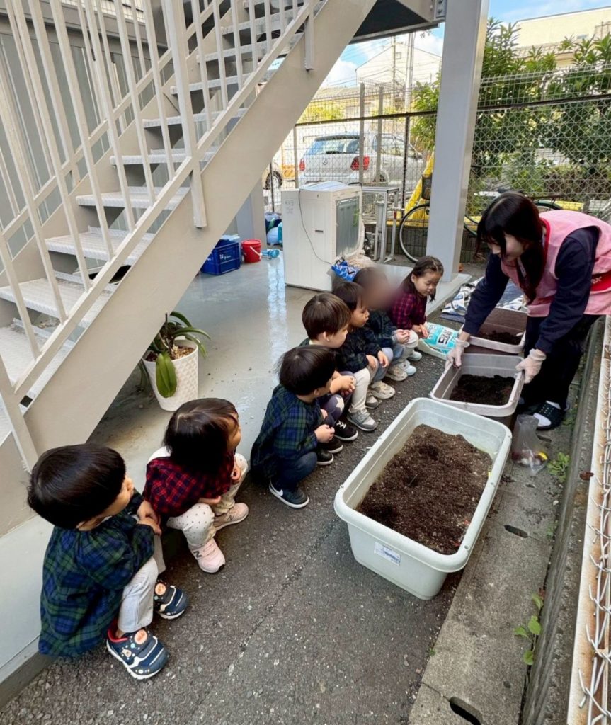 プランタに球根を入れたら優しく土をかけてあげます❤