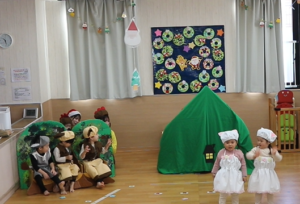 2歳児さんは、歌や劇に取り組みました。大きな声で歌ったり、身振り手振りで表現する姿に、成長を感じる場面がたくさんありました。