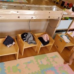 毎月の身体測定の日です! 身長、体重を測っていく前に服を脱ぎますが、さすが2歳児さん!脱いだ服も上手にたたみます♪ たたんだ服は椅子にきれいに並べます。 衣服の着脱も上手にできるようになってきてお兄さんお姉さんになってきていますね💛 …