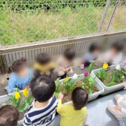 みんなで植えたチューリップの球根から花が咲きました♬ 白と赤紫色です❤ 芽が出てからずっと観察してきたチューリップ 水やりも頑張りました! 綺麗な花が咲き、子ども達みんなとっても嬉しそうです 自分たちで植えて育てた球根から花が咲いたという喜びや感動を …